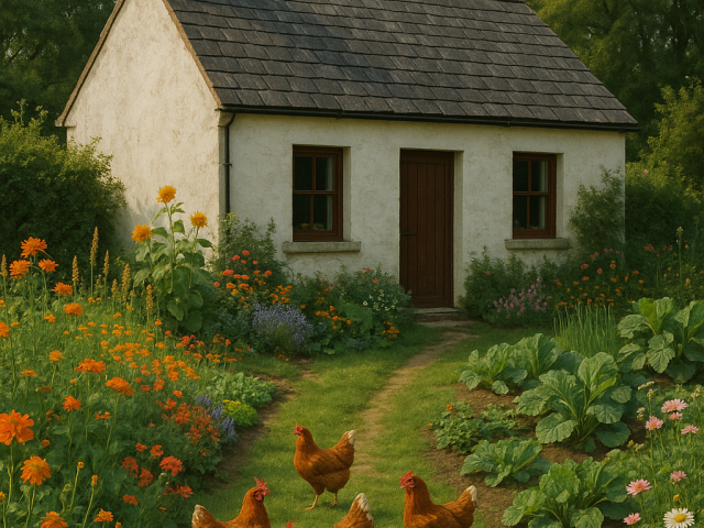With a bit of land or garden (for growing vegetables and keeping a few hens)